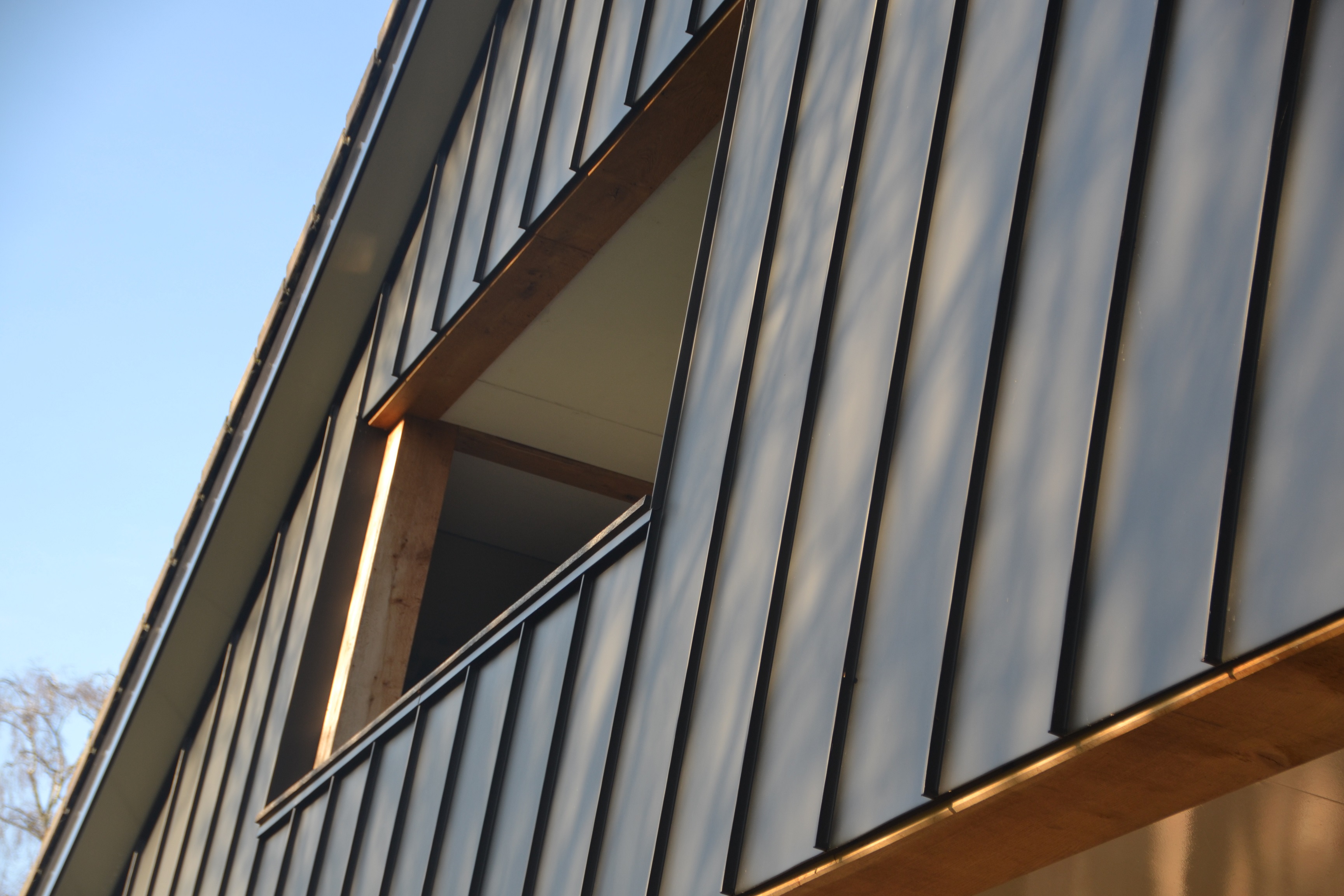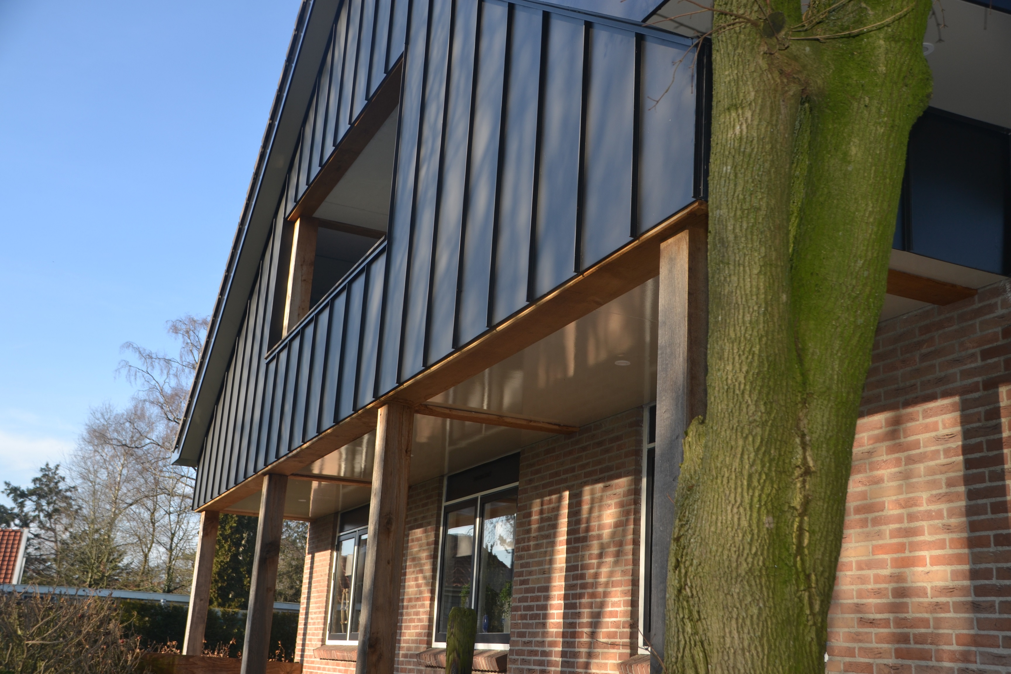 De gevel is bekleed met zinken felsbanen, verticaal. Uitgevoerd in de kleur Graphite Grey. De woning is hierdoor onderhoudsvriendelijk geworden en duurzaam, het heeft een eigentijdse en moderne uitstraling gekregen.