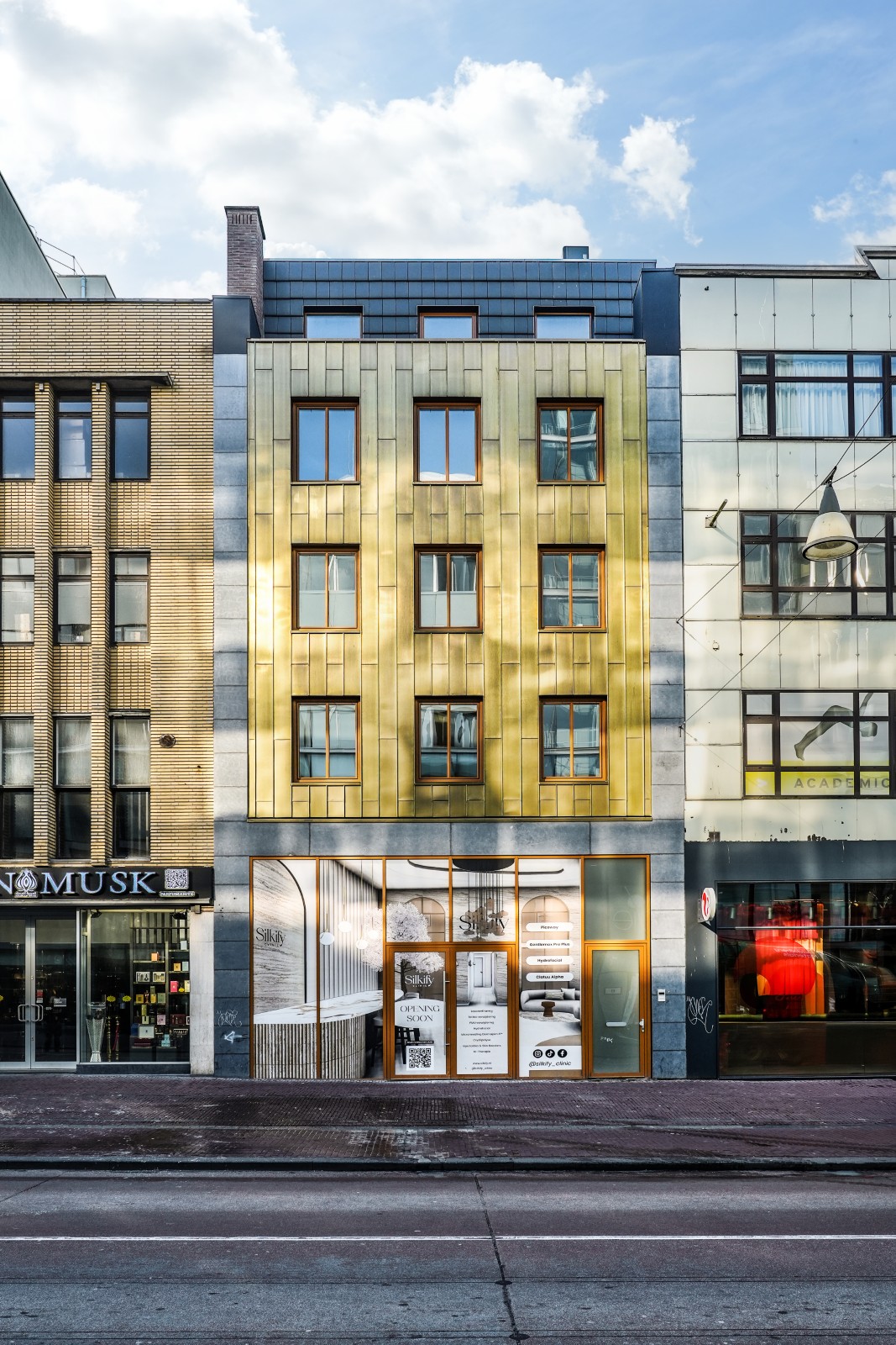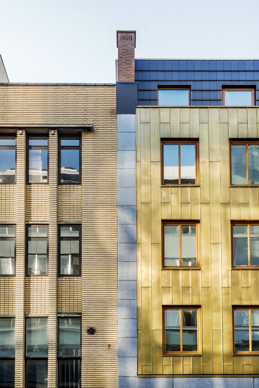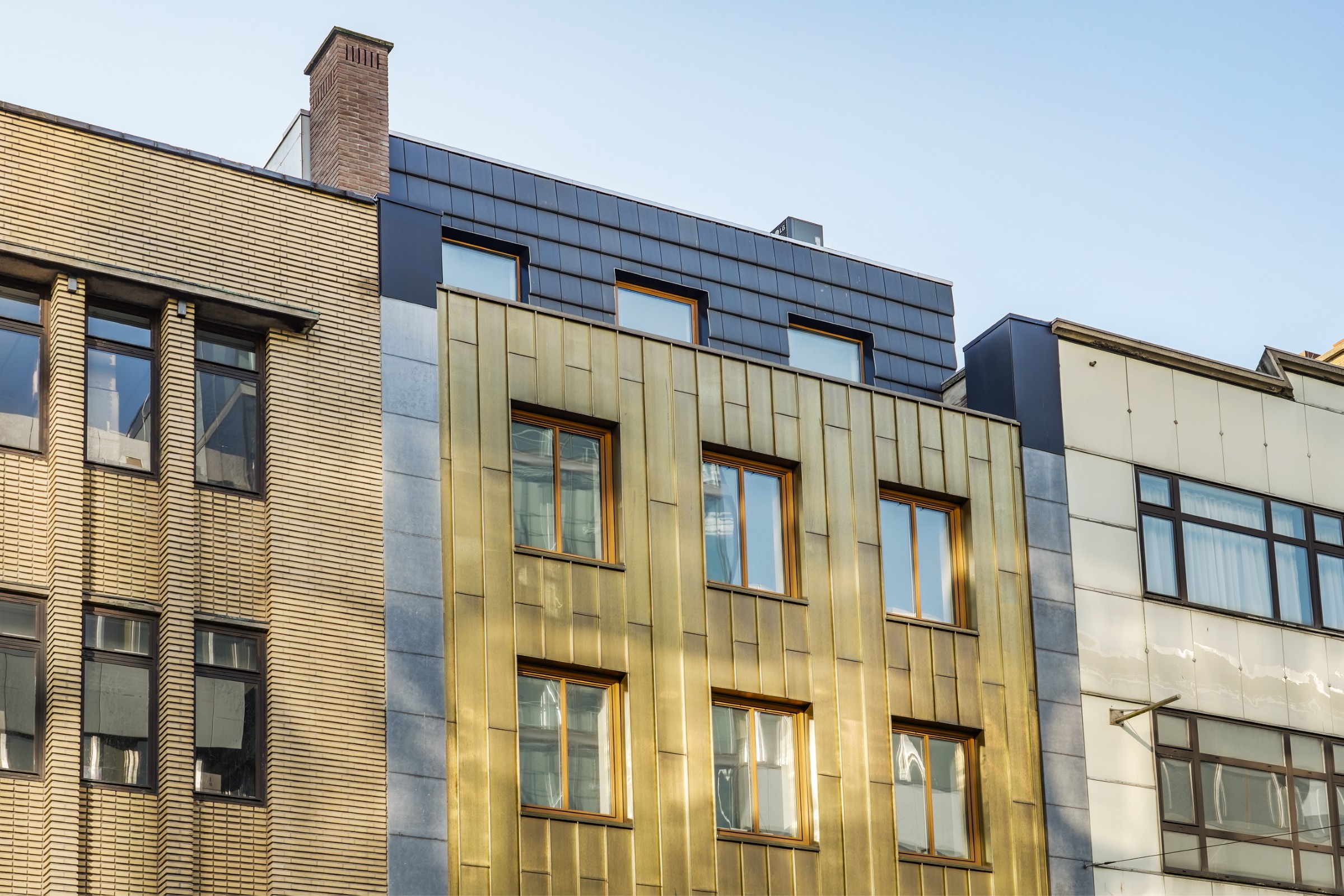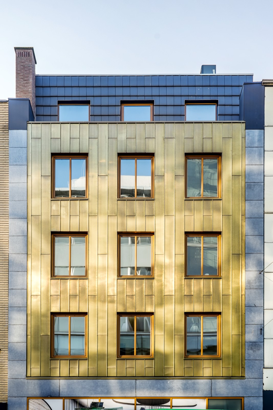 Onder invloed van weer en tijd ontwikkelt het koper een eigen karakter: van een heldere goudtint naar diepere, rijkere nuances. Zo verandert de gevel subtiel met de seizoenen en krijgt het pand een levendig en tijdloos uiterlijk.