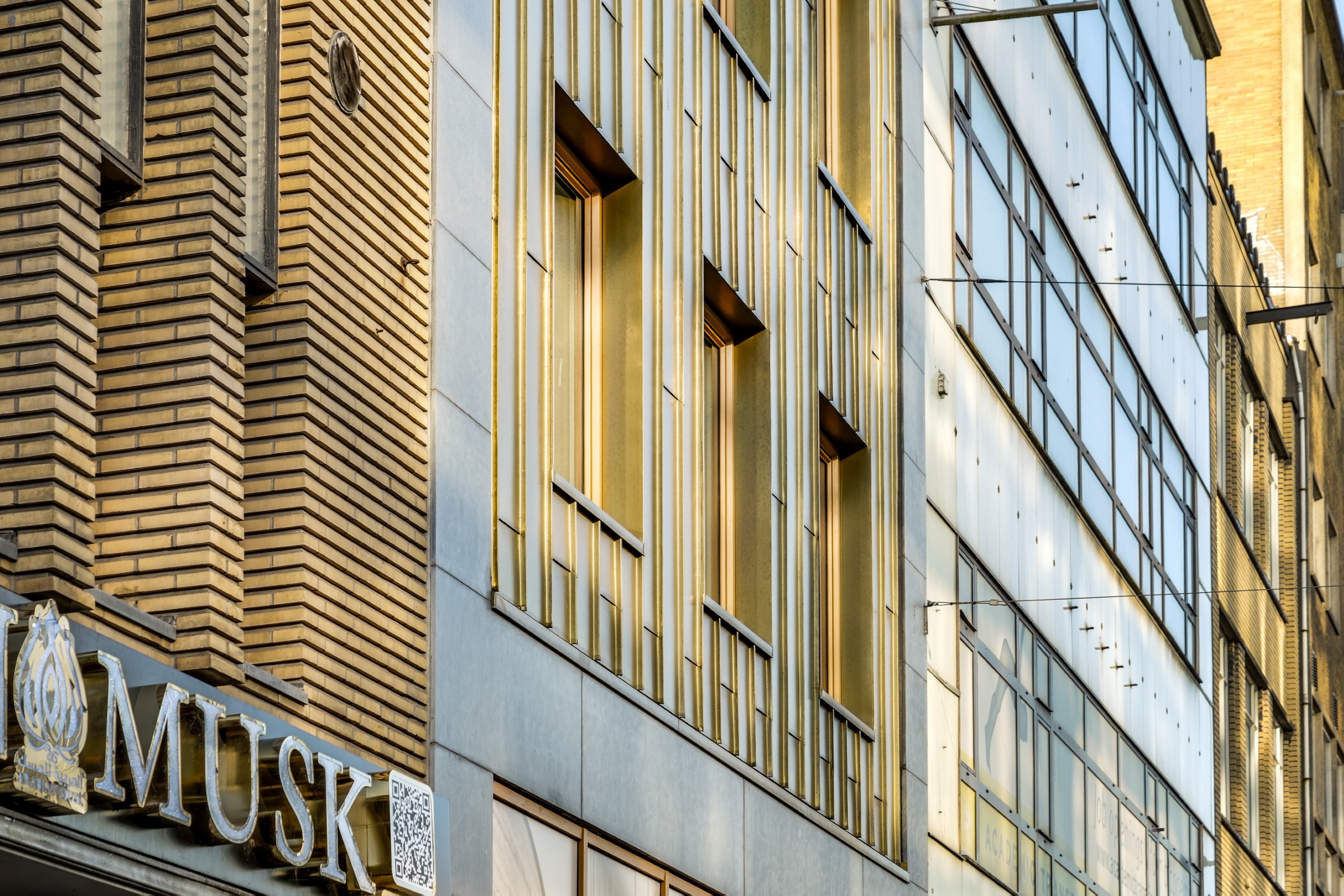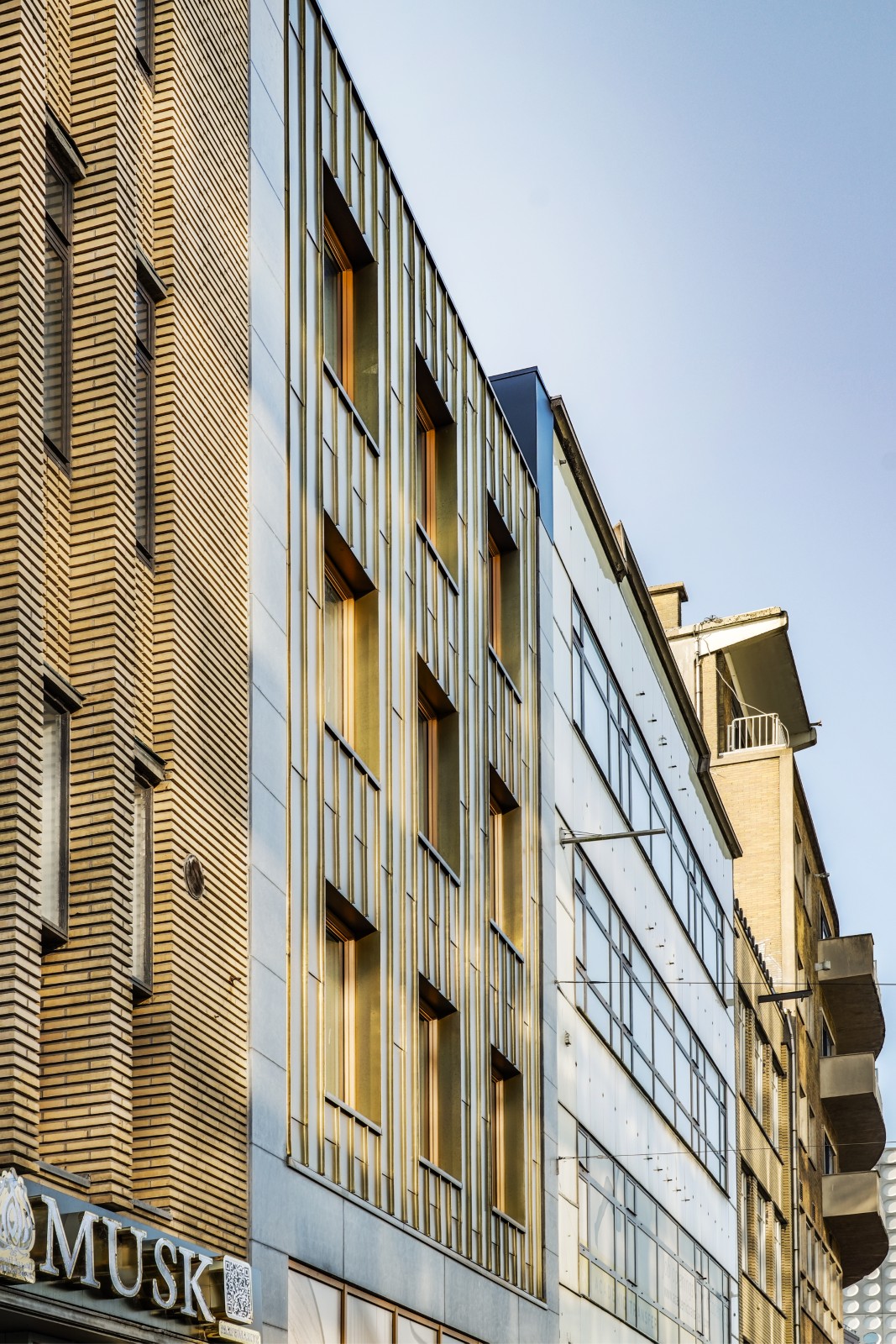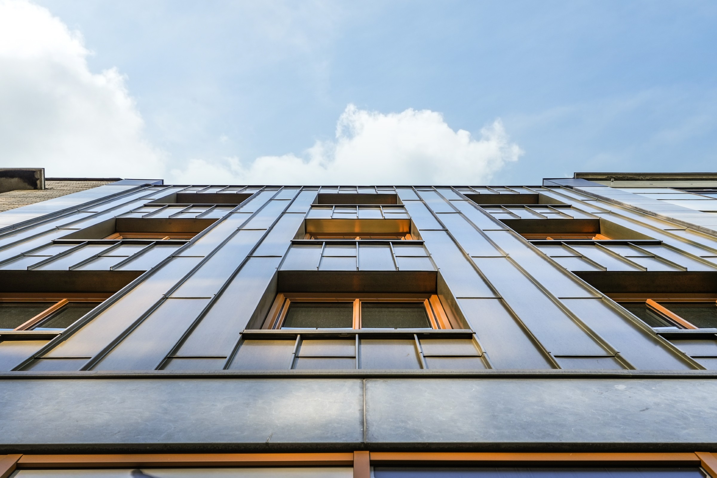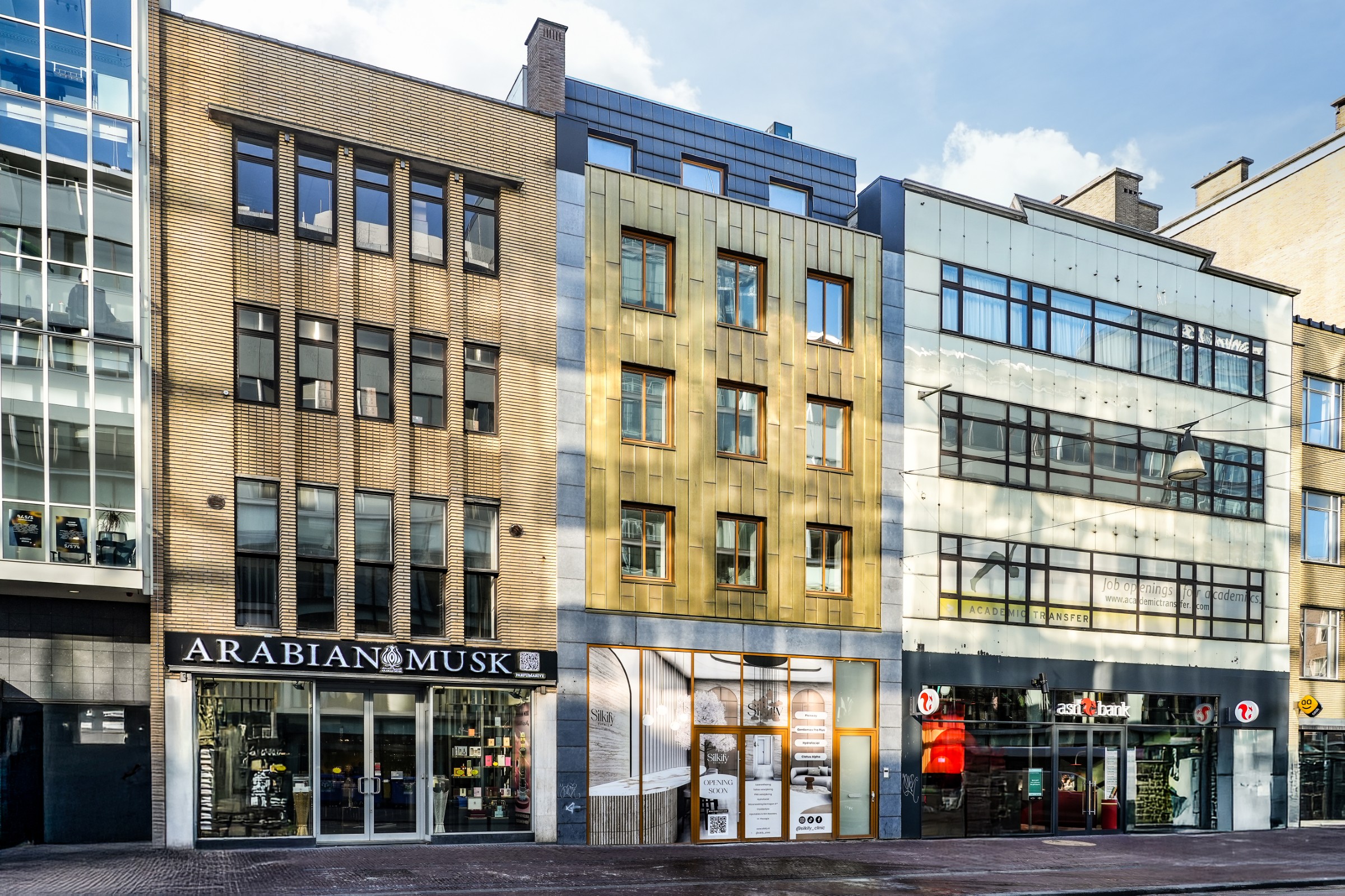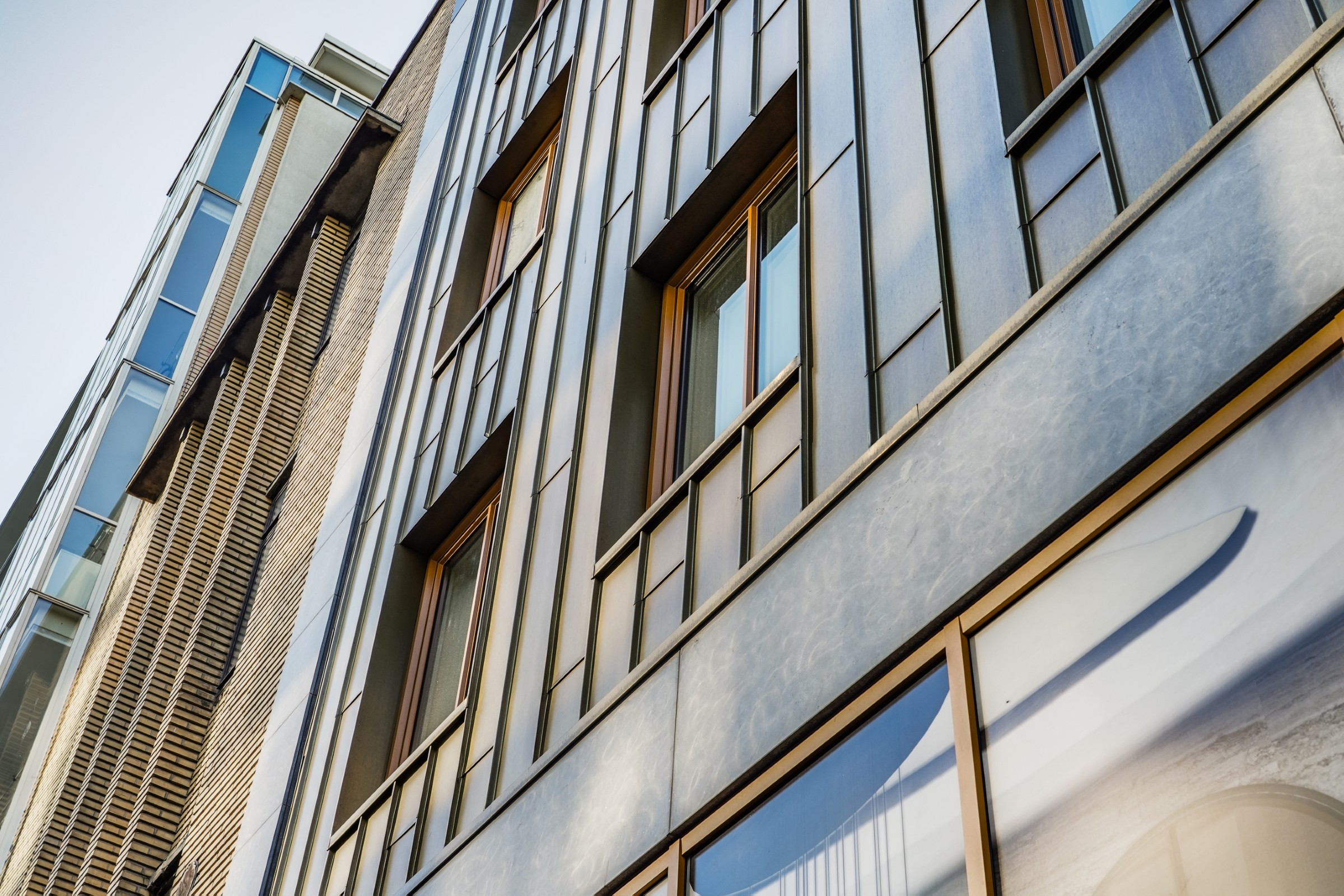 Onder invloed van weer en tijd ontwikkelt het koper een eigen karakter: van een heldere goudtint naar diepere, rijkere nuances. Zo verandert de gevel subtiel met de seizoenen en krijgt het pand een levendig en tijdloos uiterlijk.