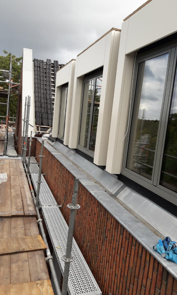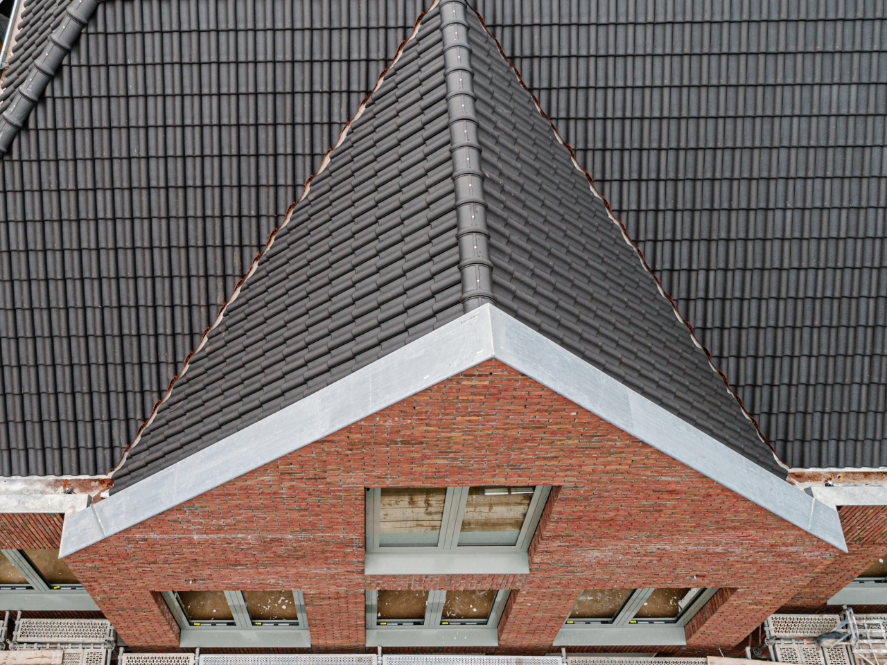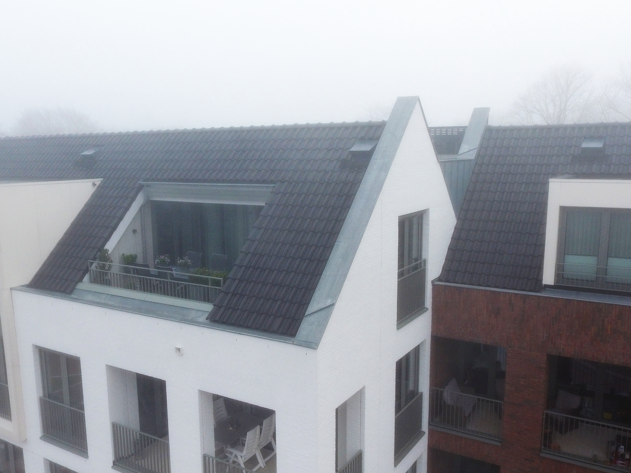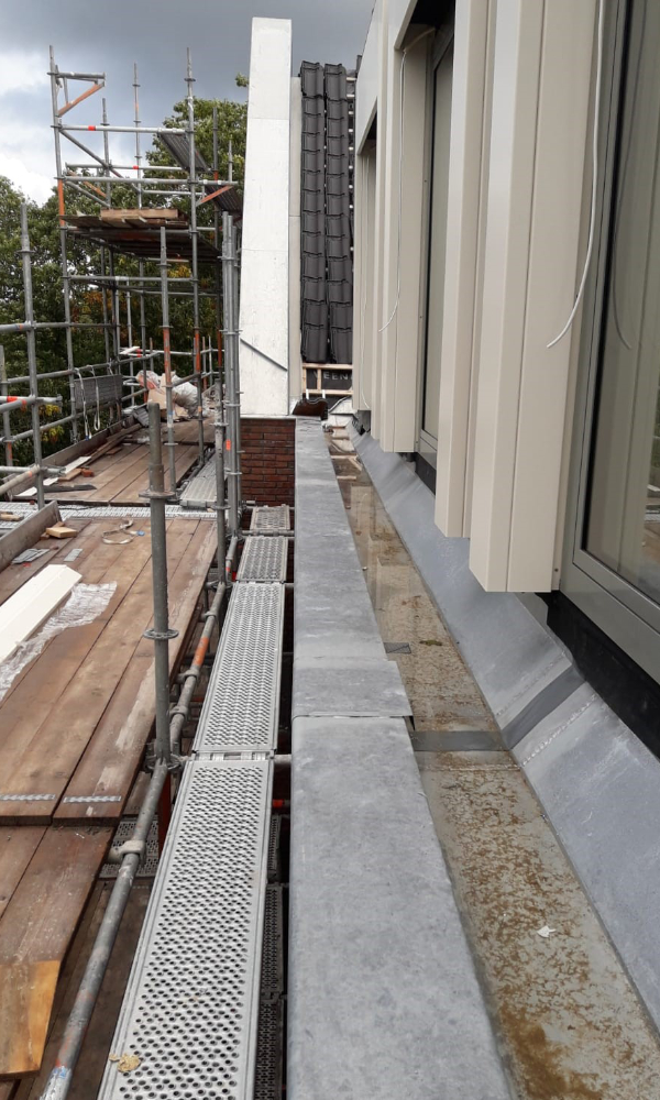 Het appartementencomplex is rondom voorzien van zinken goten. De dakkapellen zijn voorzien van verholen goten.
