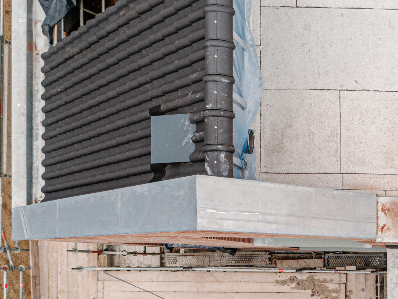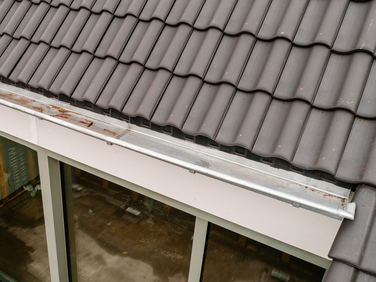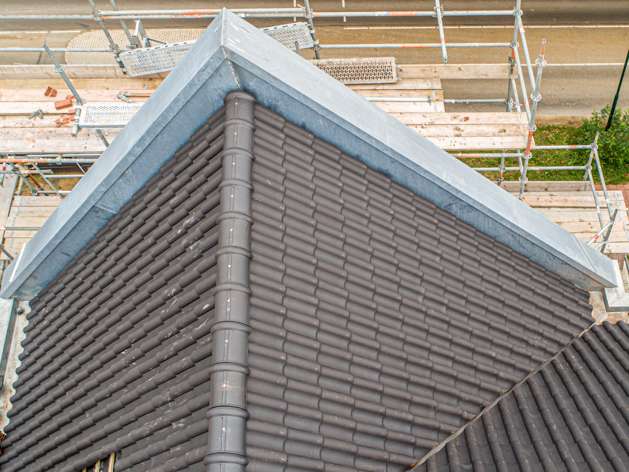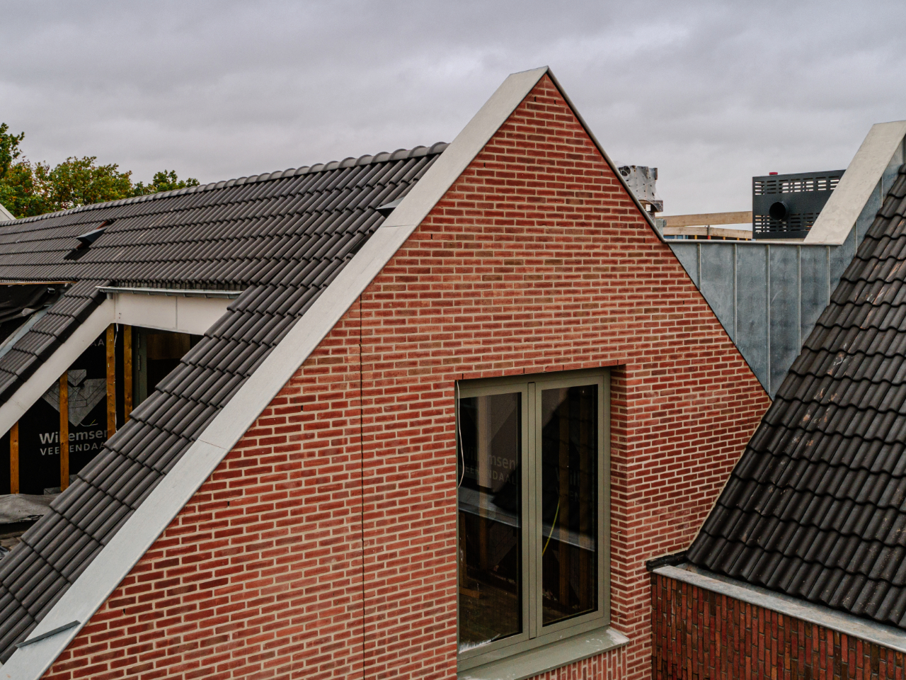 Het appartementencomplex is rondom voorzien van zinken goten. De dakkapellen zijn voorzien van verholen goten.