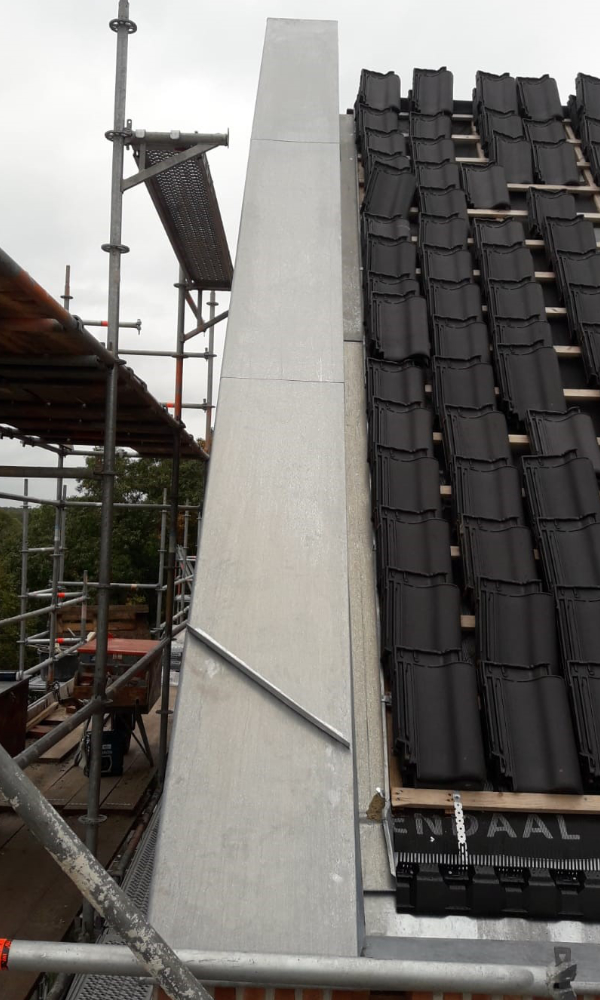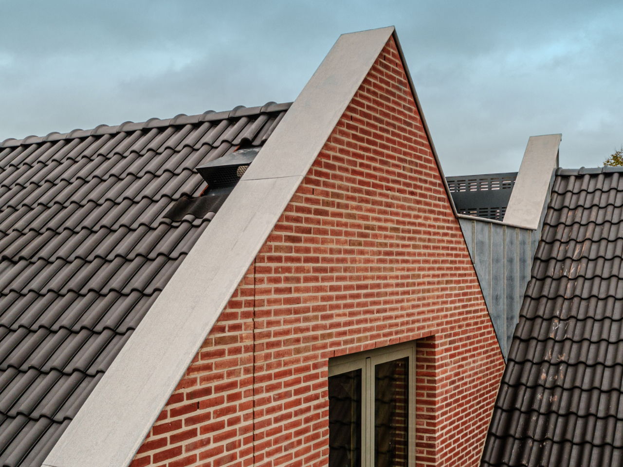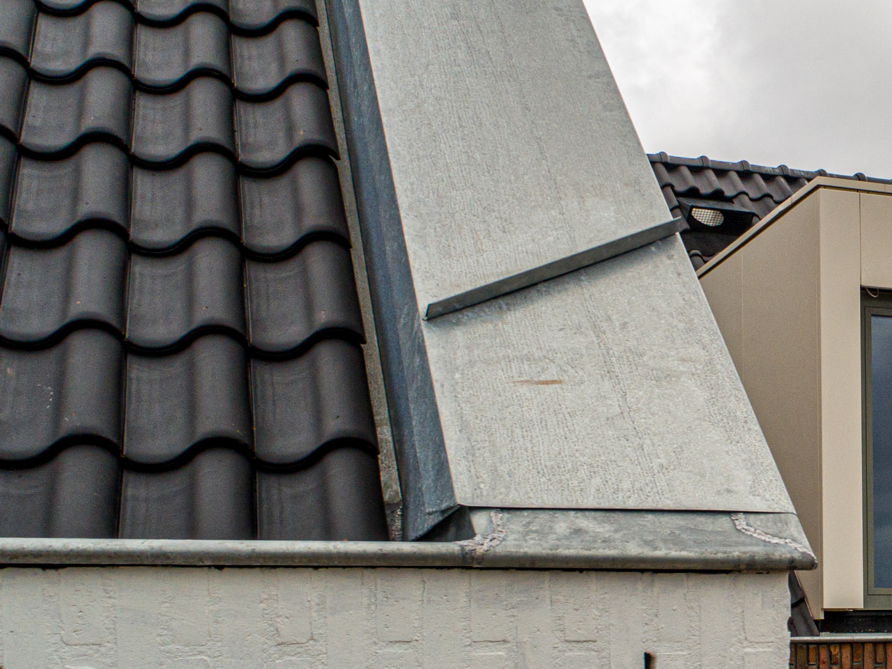 De gevelpunt is voorzien van zinken felsbanen in walsblank 0,8mm.